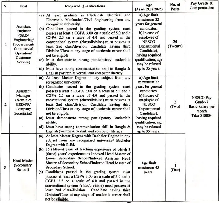 আবেদনের নিয়ম: আগ্রহীরা এখানে ক্লিক করে নর্দান ইলেক্ট্রিসিটি সাপ্লাই কোম্পানি পিএলসি (নেসকো) আবেদন সম্পন্ন করতে হবে। আবেদনের সঙ্গে ৩০০-৩০০ সাইজের ছবি ও ৩০০-৮০ সাইজের স্বাক্ষর স্ক্যান করে যুক্ত করতে হবে।