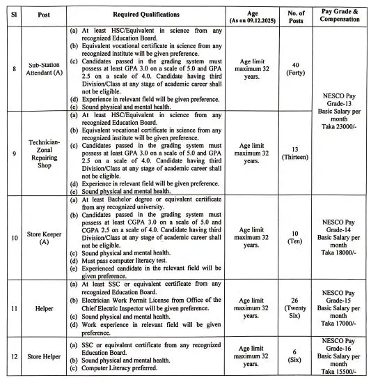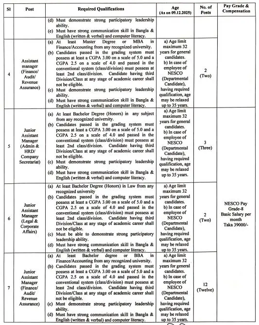 বয়স: ৯ ডিসেম্বর ২০২৫ তারিখ সর্বোচ্চ ৩২ বছর। বিভাগীয় প্রার্থীদের ক্ষেত্রে ৩৫ বছর পর্যন্ত শিথিলযোগ্য। তবে ৩ নং পদের জন্য ৪৫ বছর পর্যন্ত আবেদনের সুযোগ পাবেন।